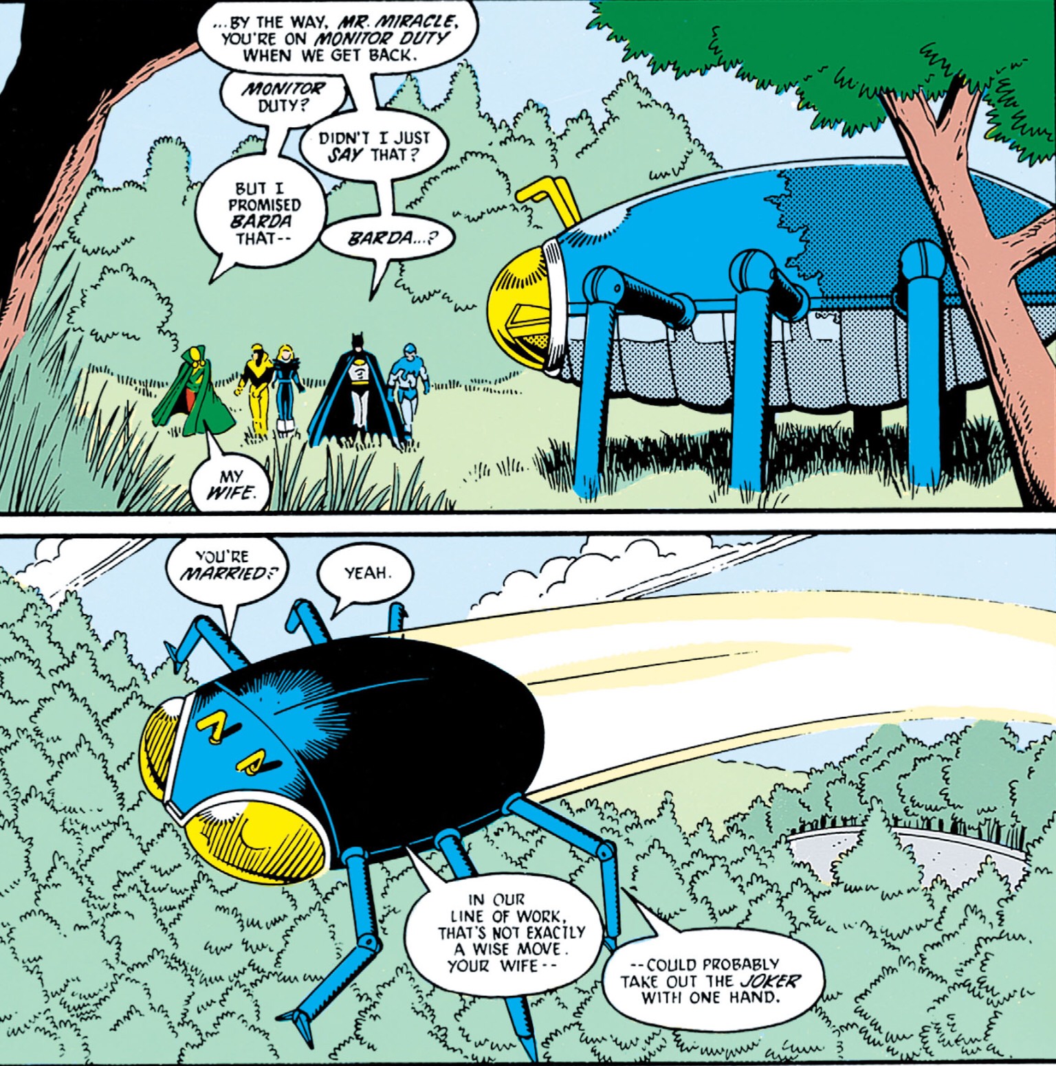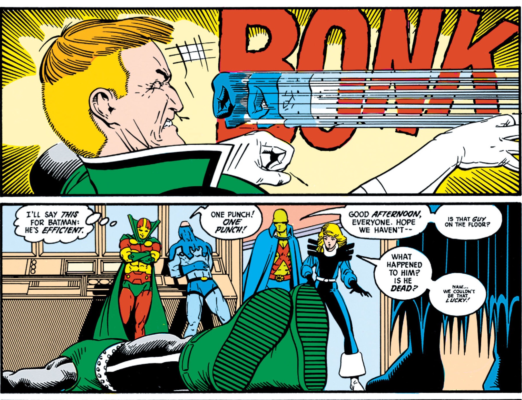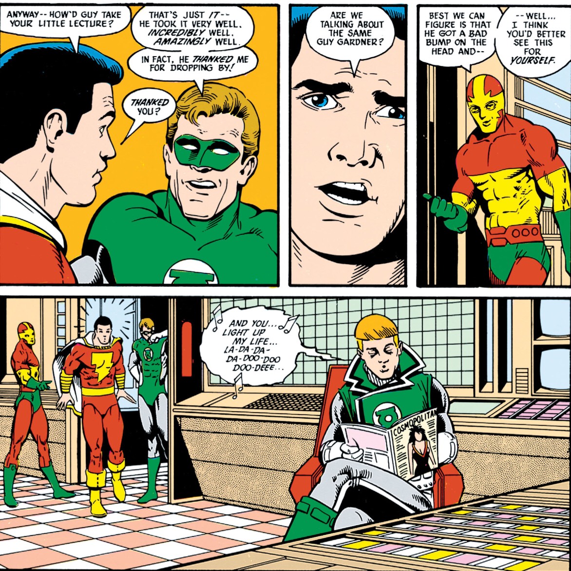 The series set up a series of conflicts very early on, page one for example. Guy Gardner was not the square Green Lantern Hal Jordan seemed to have always been. Guy was an asshole, and he was proud of that fact. We find him roleplaying being chair of the League before anyone has arrived at their old Happy Harbor, Rhode Island base. Black Canary is the second to , and so we establish two things: Guy is a chauvinist pig and Canary is not a token female on the team. Canary is hyperaware of the meta nature of women on superheroes teams at this point and is determined not to take a backseat, she has a long history with the League, and that seniority should count for something. Mister Miracle & Oberon and Captain Marvel are next on the scene, each one firmly defining their personalities. Miracle and his partner Oberon are both intimidated by this promotion to the “big leagues” and doubtful about if it’ll work out. We also get a brief moment that establishes Guy and Oberon’s biting back and forths to come. Captain Marvel has his “kid in the body of a grown-up” trope played up against Guy’s cynicism. Martian Manhunter and Blue Beetle enter side by side with the former reasonably dour and mistrustful after the very recent fall of his team while Beetle, ever the consummate businessman, sees this as his chance in the spotlight. What is the first thing this team does? Get into a verbal argument and then a physical fight. It takes the arrivals of Batman and Doctor Fate to shut things down. Moreover, immediately we get the central tension-filled relationship in the early days of the book: Batman vs. Guy Gardner.