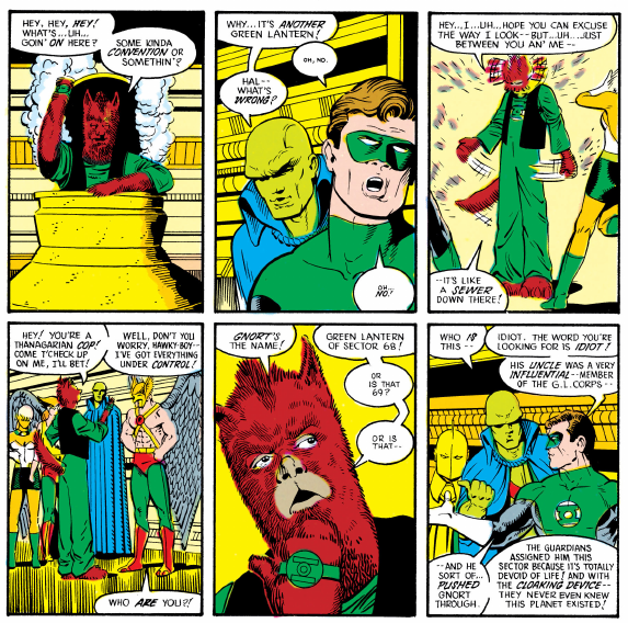 G’Nort is a dog-like alien of semi-low intelligence who is given a ring because he’s a legacy (his uncle was a Green Lantern). He’s found stationed on a lifeless desert planet, put there so he’d stay out of trouble however this planet ends up being home to the Manhunters secret base. It’s a brief appearance, and it takes a while before he makes a second appearance, but by then it is pretty clear the writers love this character, and his prominence in JLI and the Green Lantern title increases.
