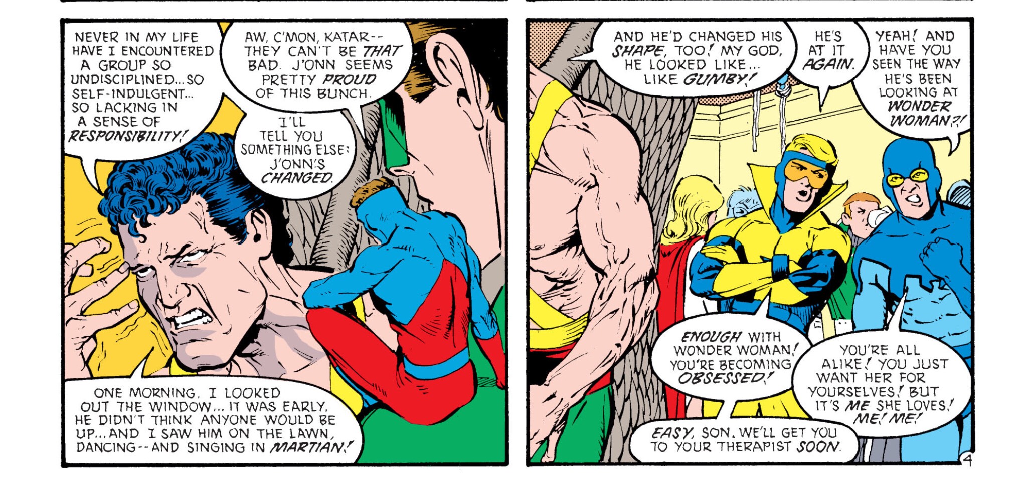 Where things shine is when there isn’t a need for any plot, and we have the characters riffing off of each other. The gathering of heroes for the grand expansion of the team is a significant event and an excellent chance for some quality comedy. Giffen & DeMatteis are already setting up a dynamic between Elongated Man and The Flash that carries over into the pages of Justice League Europe. Elongated Man, being a close friend of the recently deceased Barry Allen, can’t help but critique every one of Wally West’s decisions as The Flash. This is part of a more extensive commentary coming from members of the classic Justice League roster, showing their embarrassment at this goofy version of their team. The best part is Hawkman’s complete mental breakdown and resignation from the group when Beetle and Booster Gold push him too far.