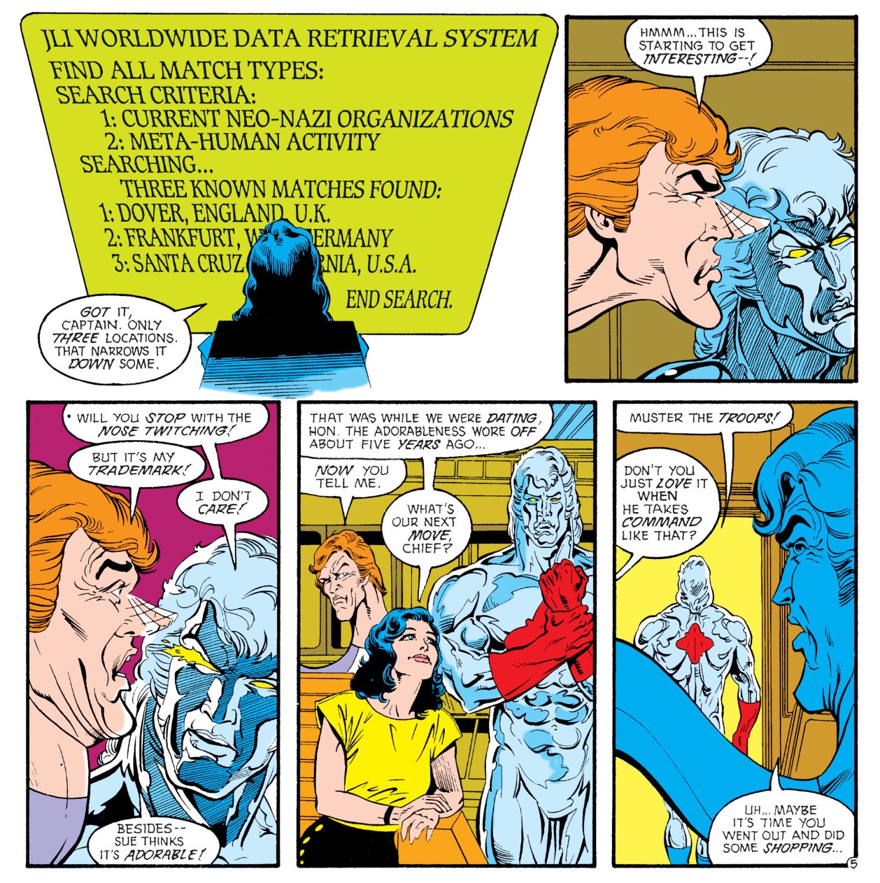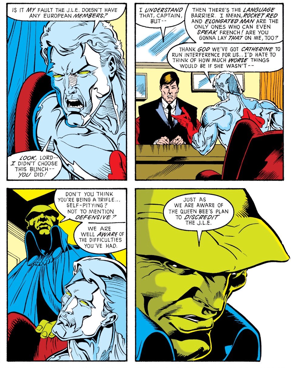 The relationship dynamics are once again the core of setting the table in JLE. Elongated Man was a partner of Barry Allen when he was The Flash. So when we put EM and Wally West in a room together, we get a fascinating conflict. EM can’t help but compare Wally’s choices as The Flash to his predecessor, and this hinders Wally quite often in forging his own identity. Captain Atom is the team leader and ends up being one of the most neurotic Justice Leaguers I’ve ever read. He has a constant monologue going on about his insecurities and neuroses. It’s a weird experience that never really clicked with me but is an ongoing joke through these issues.