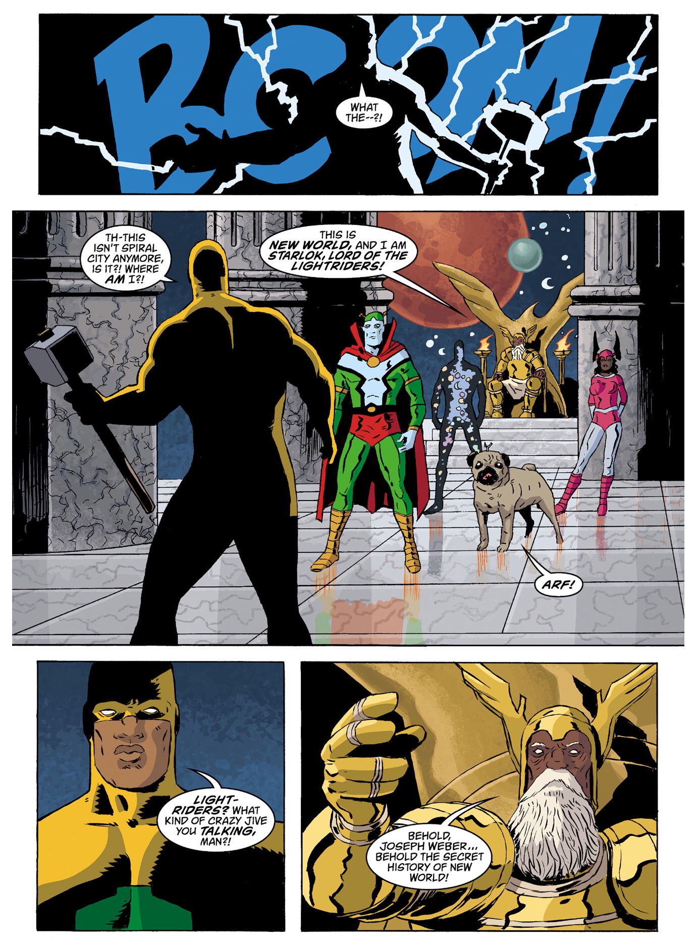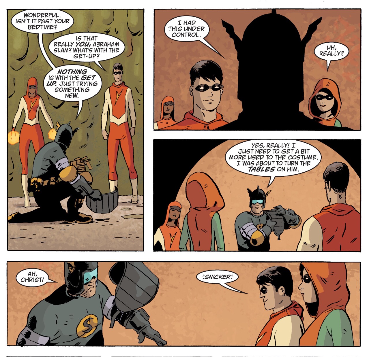 In the following issues, we have secrets revealed about Golden Gail (a Shazam pastiche) who tells the story of her retirement and secret love affair with arch-nemesis Sherlock Frankenstein. There’s the origin of Colonel Weird’s partnership with his robot sidekick Talky Walky, which ends tragically. Abraham Slam, who reminds me of two-fisted mystery men like Wildcat, tries to adapt to the grim and gritty turn of superheroics in the 1980s. Barbalien, the series’ answer to Martian Manhunter, recalls the ostracizing he received while posing as a human police officer juxtaposed against his current struggles after realizing he has feelings for the town’s minister. All of this culminates in a moment hinted at since the arrival of Lucy Weber and opens up the story to go in some exciting and revelatory new directions.