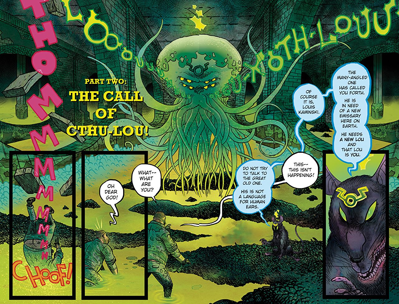 Metal Minotaur is a play off of cybernetically enhanced characters like The Rhino from the pages of Spider-Man or to a lesser extent some of the Iron Man analog villains (Crimson Dynamo, Titanium Man). Lucy Weber is shocked when she learns this hulking, metallic brute was a woman. As the story of the Metal Minotaur unfolds we learn about a moment of exceptional empathy Black Hammer showed his nemesis at a point in her life when her role as a villain and her desire to harm him reached a dangerous climax. Like all the other interviews with villains, this is a very dialogue heavy story. The emphasis is on whom these characters used to be and where they are at now, exploring different reactions than we expect to well-trod comic tropes. I connected with the Metal Minotaur story over the Cthu-Lou issue with that previous chapter feeling more comedic than dangerous.