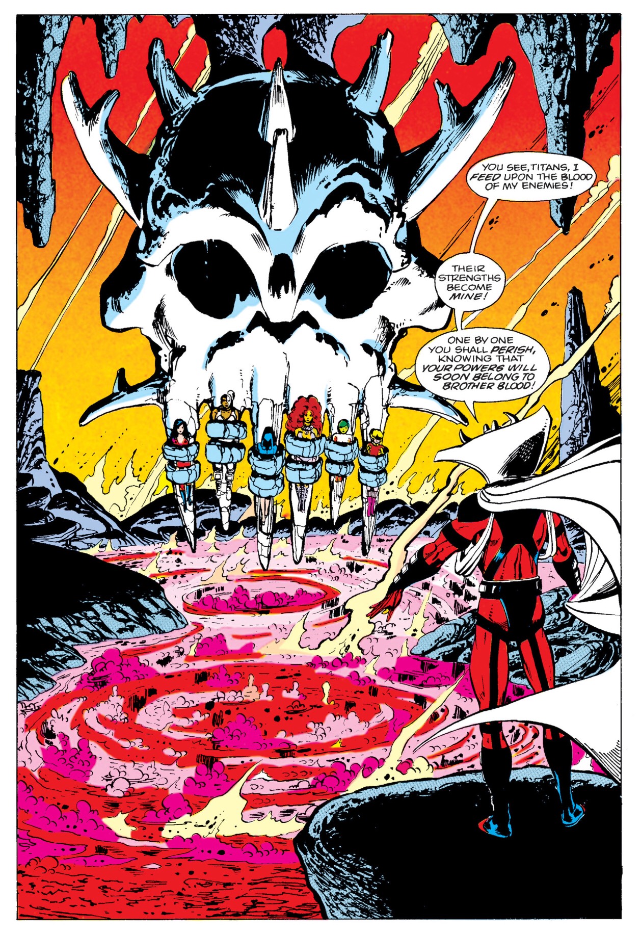 I was also unaware of how present The Church of Blood was throughout the 1980s Titans series. They are a near constant menace but also make HIVE a bit redundant. Having two secret cabals can get a bit confusing, and I think integrating the two into one monolithic villainous organization would have been better. I do enjoy how the public face of The Church of Blood is one of positive, philanthropic endeavor and so the Titans are always failing to convince the public of Brother Blood’s real intent. It was smart to have Bethany Snow, a news reporter, in the Church’s pocket so she can affect the public perception of the Titans. I wonder how deep this element of the series cut as it is very clearly inspired by the growth in cults that attracted youth in the 1970s and 80s, as well as the very psychically devastating Jonestown massacre of 1978. In an interview with TwoMorrows publishing, George Perez admits that Brother Blood is “a little too villainous looking for people to be following him as a cult? Shouldn’t he look a little more benign to make him acceptable to the modern media on first glance?” I agree, the second costume we get in this volume with its skull mask complete with horns is comical.