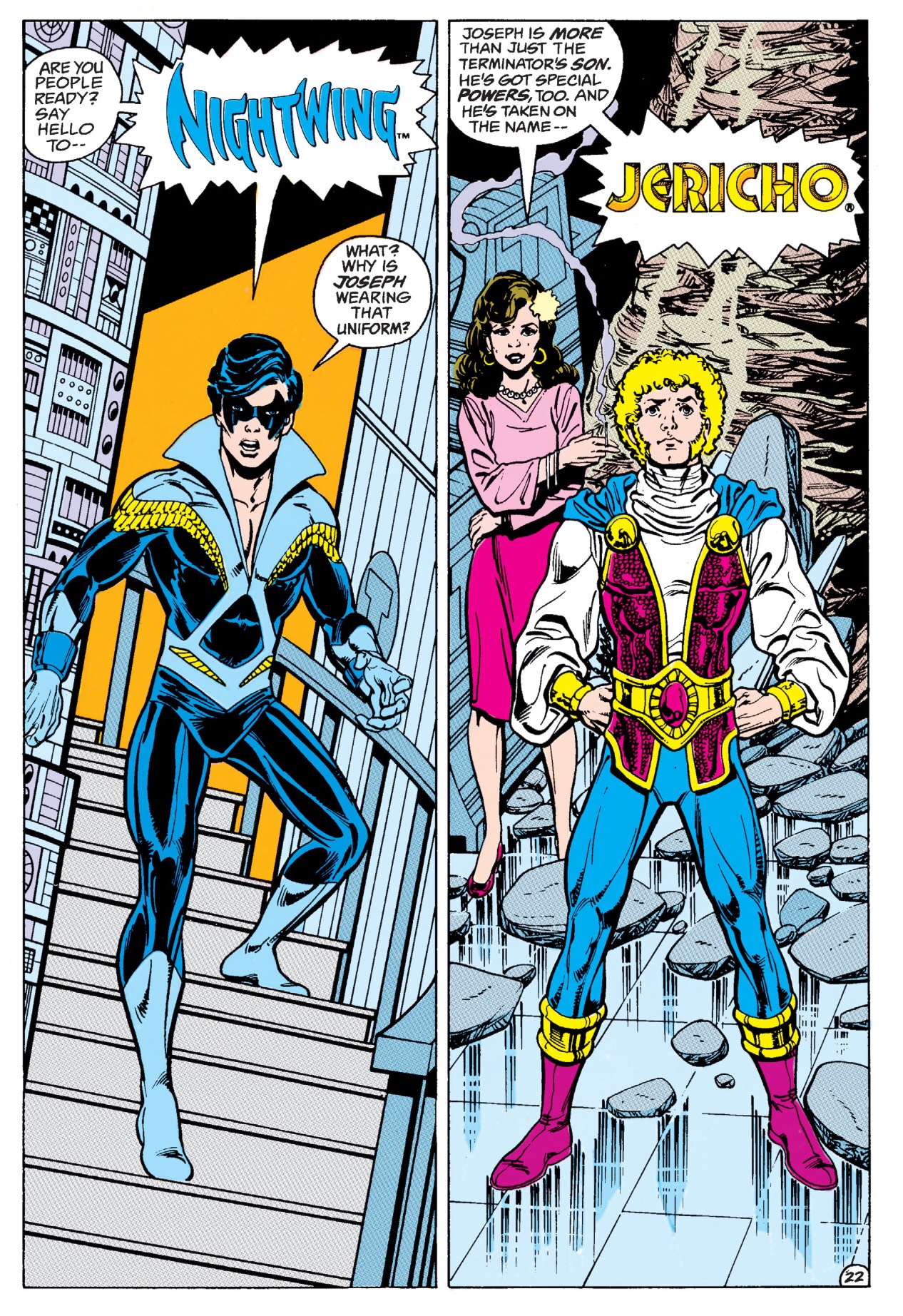 Deathstroke the Terminator is ready to make his killing blow on the Teen Titans, finally sending his mole Terra into action against the team. One by one, Cyborg, Changeling, Raven, Starfire, and Wonder Girl are taken out and delivered into the hands of the HIVE. Dick Grayson escapes capture only to run across Adelie Wilson and her mute son Joseph. Adelie is the ex-wife of Deathstroke and reveals the mercenary’s origins as well as the fate of their youngest son Joe. Grayson finds himself at a crossroads and taken on the moniker of Nightwing, joined by Joe Wilson, who as Jericho can transfer his consciousness into the bodies of others. This story is a brand new day in the history of the Titans and a moment that will resonate throughout their entire run and into contemporary comics.