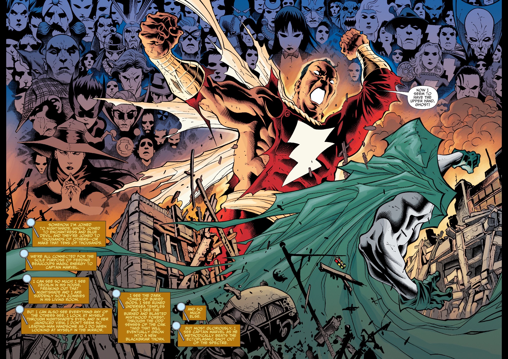 Beyond the Shadowpact, the story is showcasing big moments in the death of magic. The Spectre battles the tree-like Blackbriar Thorn who uses an entire forest as his body. The big moment is when The Spectre assaults the Rock of Eternity, the home to the powers of Shazam. It was clear leading up to this story that DC was making big shakeups with the Shazam family, and it comes to fruition here with the wizard Shazam being killed. Billy Batson’s powers falter as a result, and it’s clear to the audience that things will only get worse.