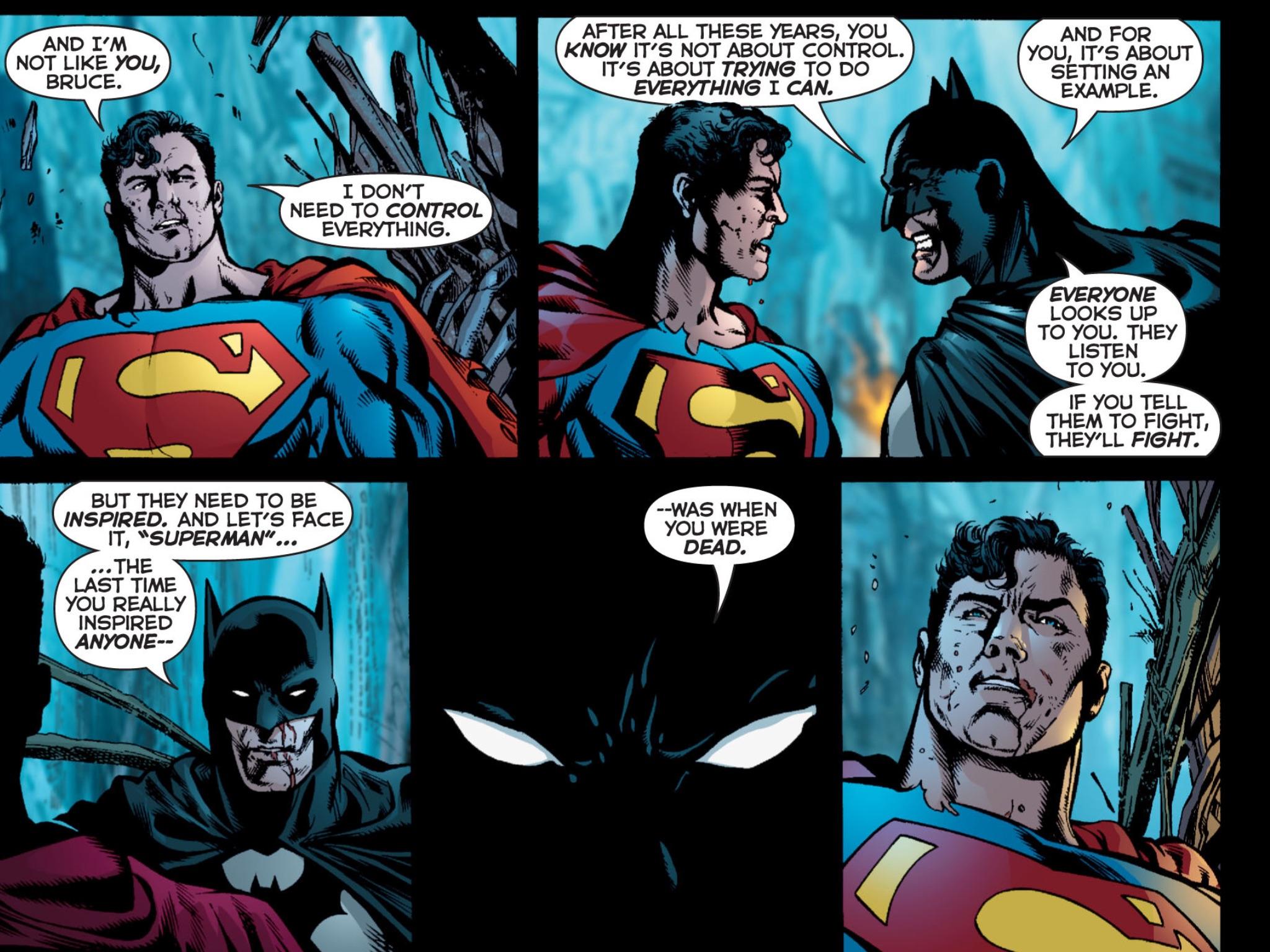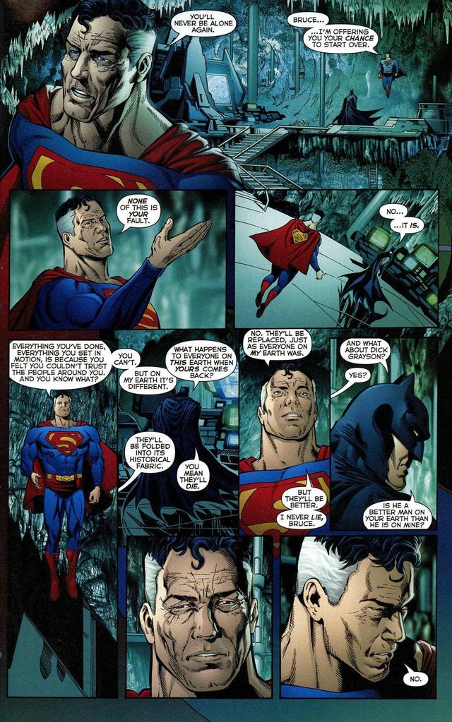 The villains have been organized by Lex Luthor and finally execute their attack across the globe. The Justice League is in tatters after the revelations of Identity Crisis and the fallout from The OMAC Project. This leads to Superman, Batman, and Wonder Woman having a verbal confrontation in the ruins of the League’s headquarters The Watchtower. By the end of the first issue, it’s revealed that four people thought to be lost in the conclusion of Crisis on Infinite Earths are alive: Superman and Lois Lane of Earth-2, Alexander Luthor of Earth-3, and Superboy of Earth-Prime. As the event progresses we learn that these four, trapped inside a pocket dimension, have watched the DC Universe as it has sunk into darkness, heroes becoming more violent and betraying the virtues expected of them.