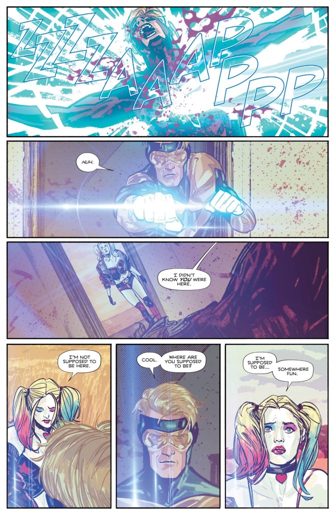 The stars of this limited series are Harley Quinn and Booster Gold. The former I hate, and the latter is one of my favorite characters, so already I am in a weird headspace with this mini-series. Harley has become DC’s answer to Marvel’s Deadpool, and that is another character I dislike. They exist to showcase how ironic a writer is, and they inject a cynicism into a genre I believe works best when it’s heroes are earnest. Booster is not the same Booster I grew to love while reading old JLI/JLA comics. This is Tom King’s reinvention of Booster who has been seriously messed up from his time travel and reality-altering antics. Next summer I’ll be diving into King’s complete Batman run where I’ll go more in-depth about this particular wrinkle in Booster’s character. Both Booster and Harley have seen the incident at Sanctuary from opposing viewpoints, and as the story goes more in-depth, we learn that their perspectives were manipulated.