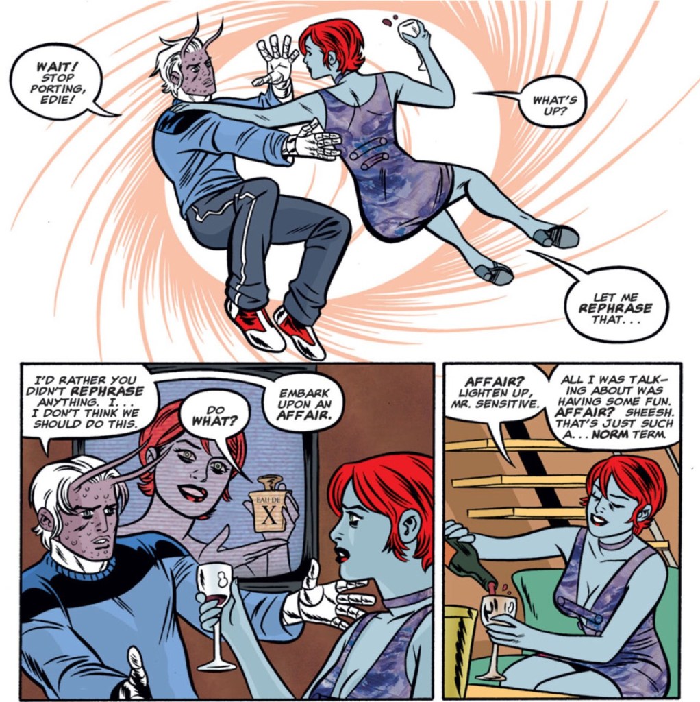 U-Go Girl, aka Edie Sawyer, has a limitless form of teleportation and can pull any number of people along with her. She grew up in a small Midwestern town. Edie becomes one of the most popular members of the team and develops a complex as The Orphan and The Anarchist fight for the position of team leader. While they are newbies, Edie has survived a few iterations of the team. She believes that leadership position is her right. Edie’s relationship with The Orphan becomes hugely complicated, and we eventually get a lot of her backstory, which explains much of where the character’s cynical mindset stems from.