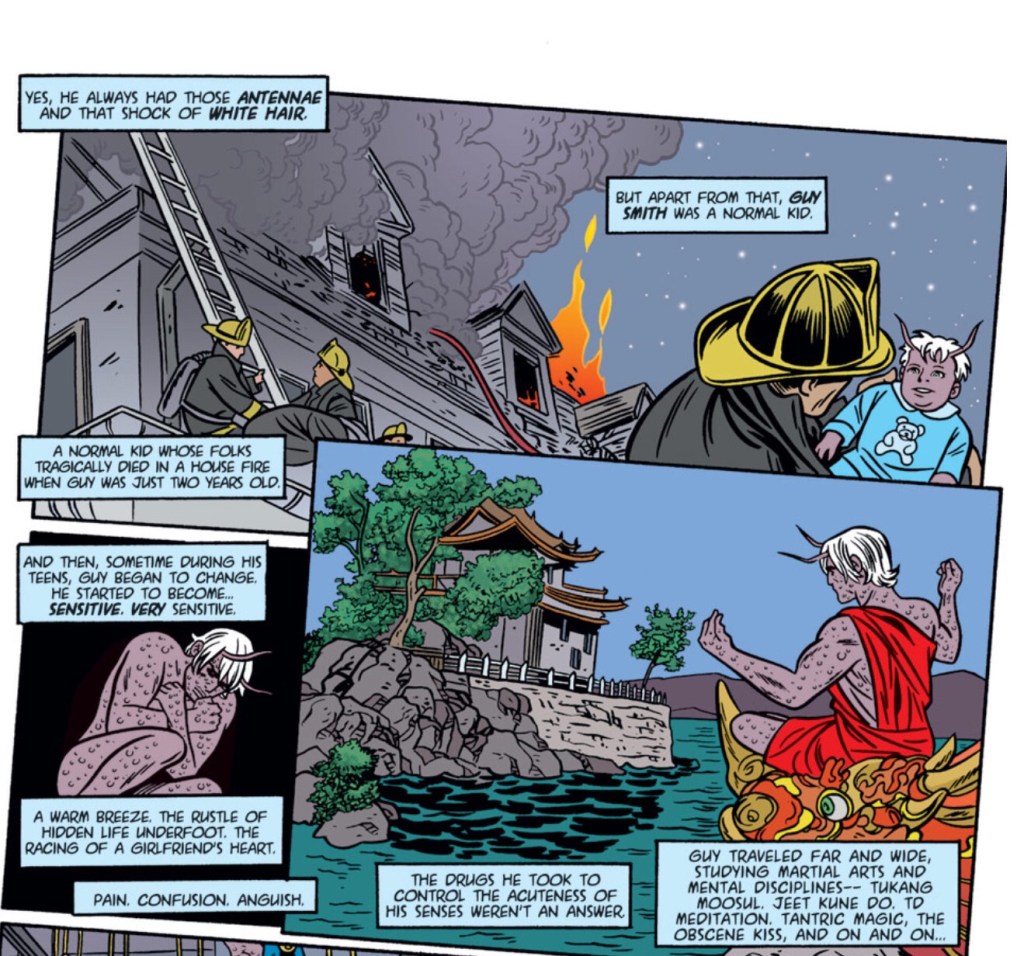 The series mainly revolves around three team members: The Orphan, U-Go Girl, and The Anarchist. The Orphan, aka Guy Smith, is a purple-skinned man with antennae who is so hyper-sensitive he’s on the same level as Wolverine or Daredevil in terms of perception. His parents died in a mysterious fire leading to his moniker, and he has developed clinical depression. Each evening, The Orphan puts a loaded revolver to his head and pulls the trigger, tempting fate and testing the universe to see if he has a higher purpose.