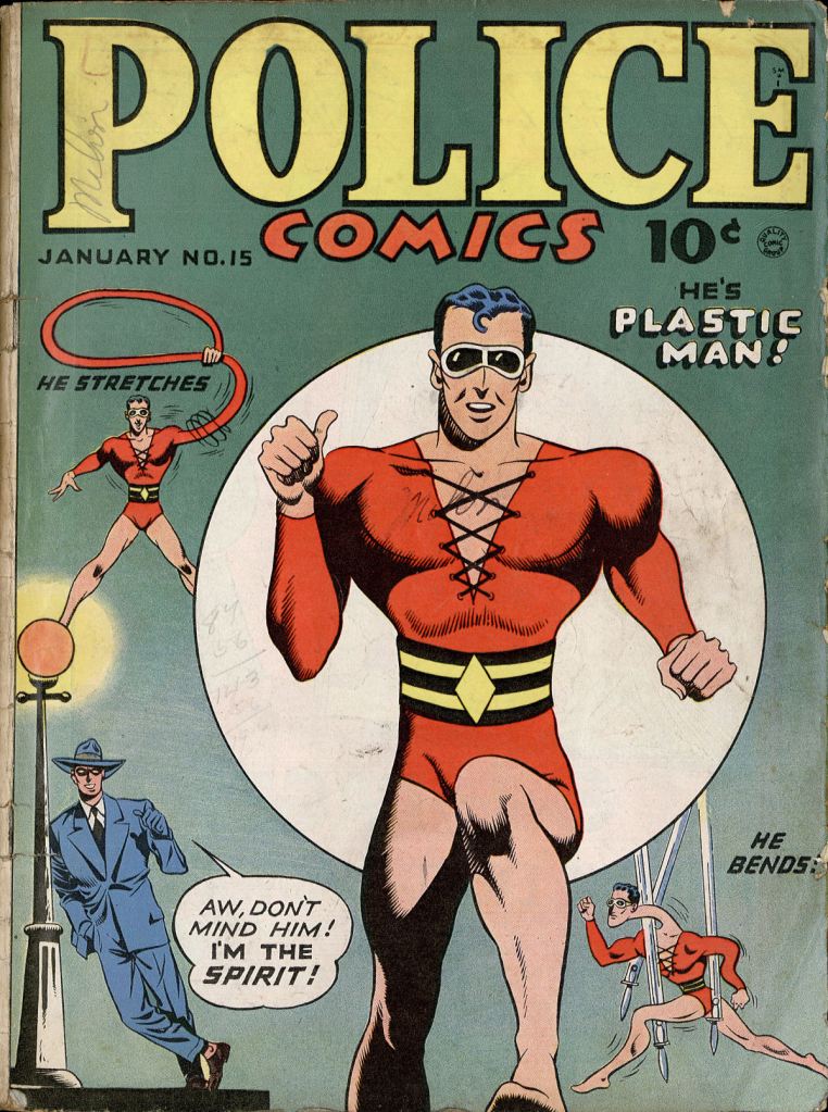 Plastic Man was the creation of writer-artist Jack Cole while he was working for Quality Comics. His first appearance was in Police Comics #1 (1940). Cole was also responsible for creating Midnight, a very obvious knock-off of Will Eisner’s The Spirit. Those were the only memorable characters Cole created with the rest of his work, which is made up of horror stories and eventually Playboy cartoons.