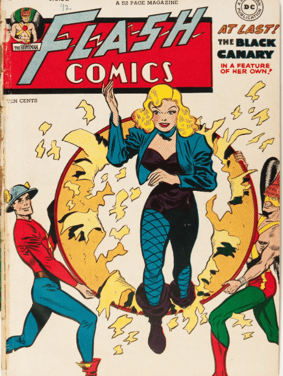 Black Canary was created by Robert Kanigher and Carmine Infantino in Flash Comics #86 (August 1947). She was intended to be a female version of the street level mystery men crimefighters of the era. Her original gimmick is that she would infiltrate criminal organizations and destroy them from within. Canary was very sexualized in her early appearances, with some aspects like her fishnet stockings playing into kinks of the day. The same sort of sexuality was imbued into Wonder Woman through elements like bondage. It’s an aspect that separates the female characters from the male ones, the latter of whom didn’t get objectified as much. There is still some latent homoeroticism in the pulp fiction of this time, but that’s a conversation for another time.