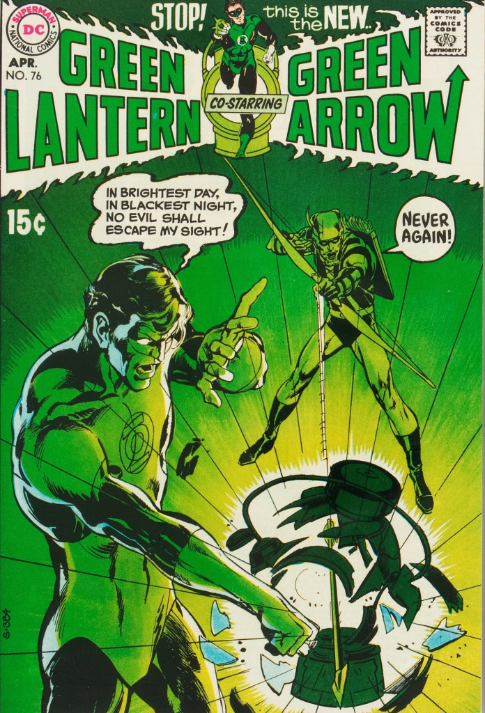 This continued when O’Neill became the writer for Green Lantern’s major reboot in #76 (April 1970). The book was retitled Green Lantern/Green Arrow and paired the two characters up for what is referred to as the “Hard Traveling Heroes” arc. Hal Jordan, the Green Lantern, served as the voice of establishment liberals advocating for incrementalism while Oliver Queen fought for a more radical, drastic approach. Queen convinces Jordan to stop doing everything the Guardians and the Green Lantern Corps told him and come back down to Earth so he can see everyday problems. The two travel across the United States, witnessing and trying to solve government corruption, racism, pollution, and even a potential analog for the Manson Family.