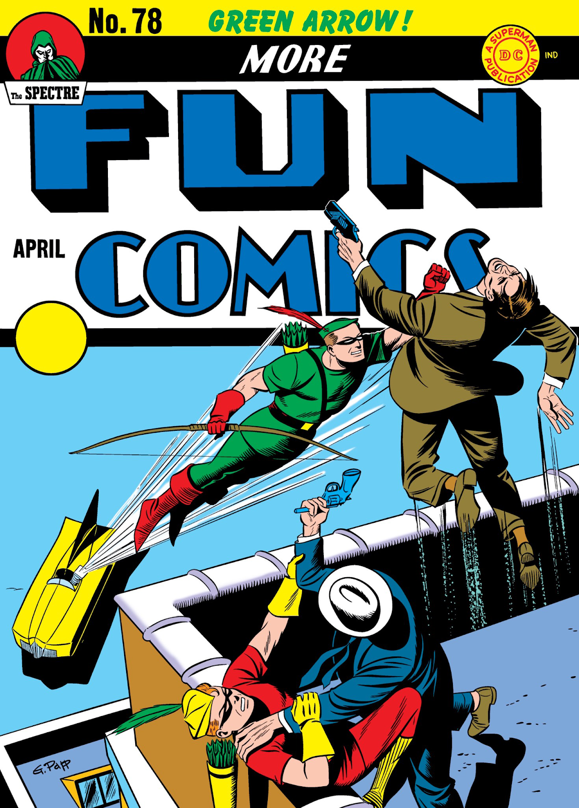 Over time, Weisinger retooled Green Arrow to resemble Batman even more. He had an Arrow-Cave, Arrowcar, and Arrow-Plane. The Star City police used an Arrow Signal to summon the hero. At one time, he even had a short-lived clown-themed arch-nemesis named Bull’s Eye. Arrow also used a series of trick arrows, with some of his more famous being the Boxing Glove Arrow, Flame Arrow, and the Boomerang Arrow. Green Arrow started as a back-up feature in More Fun Comics, headlined in the 1940s by Doctor Fate and The Spectre, both broody and occultish darker heroes. But as Batman & Robin, with their cheerier dispositions, became more popular, Green Arrow & Speedy were given the cover spotlight.