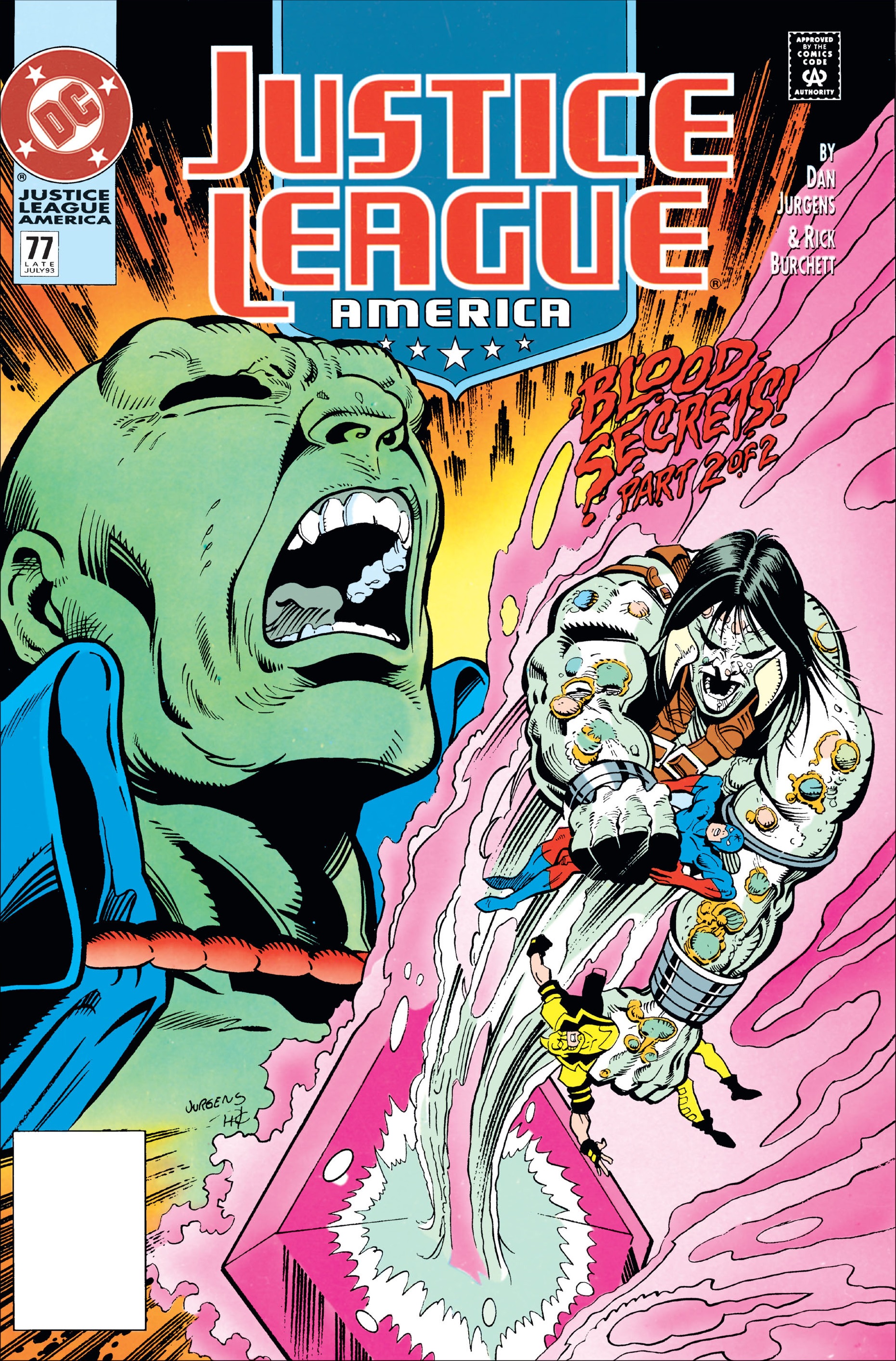 In fact, J’onn assumed the identity of the necromancer Bloodwynd and joined a new roster led by Superman. The real Bloodwynd was trapped inside the blood gem that J’onn wore as part of his costume in this form. He participated in the battle against Doomsday which led to Superman’s death, and during the fight, Blue Beetle realizes Bloodwynd is his old friend. The JLA, with help from the shrinking Atom, goes on a journey into the blood gem leading to J’onn and Bloodwynd being separated into their respective bodies.