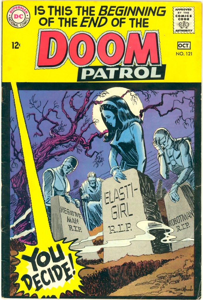 Doom Patrol was the creation of writers Arnold Drake & Bob Haney and artist Bruno Premiani. My Greatest Adventure was on the verge of cancellation, and Drake decided to create a feature that might revive interest in the title. His first pitch was for a super-powered duo: Elasti-Girl and Automaton, but he decided to add a third character to the mix. Bob Haney came up with Negative Man to complete the team. Their original title would be The Legion of the Strange, emphasizing what an odd mismatched group of superhumans they were. The trio would be led & mentored by Niles Caulder, aka The Chief. He was a wheelchair-using scientist who wasn’t always honest with his proteges. They also fought and argued with each other, which made for a series that wasn’t like much else found at DC at the time.