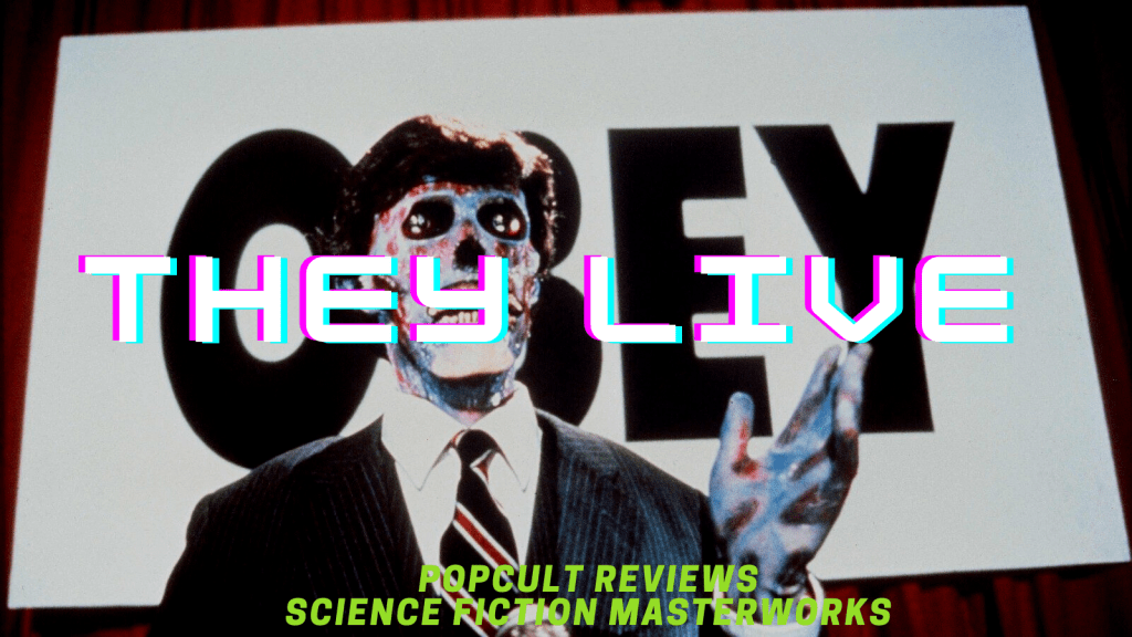 A homeless drifter, whom the script names Nada (Roddy Piper), arrives in Los Angeles searching for work. He encounters a blind street preacher who talks about how “they” have used the wealth & power of this world to crush humanity. He runs into the preacher again after joining an encampment of houseless people. The preacher operates out of a church across the street and seems to be working with members of the encampment. Upon further investigation, Nada discovers they are manufacturing sunglasses out of the holy place. When he puts on the glasses, he can suddenly see a hidden world of subliminal messages that command humanity to consume and obey. Nada also realizes not every person walking around on the street is human and that a race of aliens has taken over positions of power on Earth and is stripping it bare of resources.