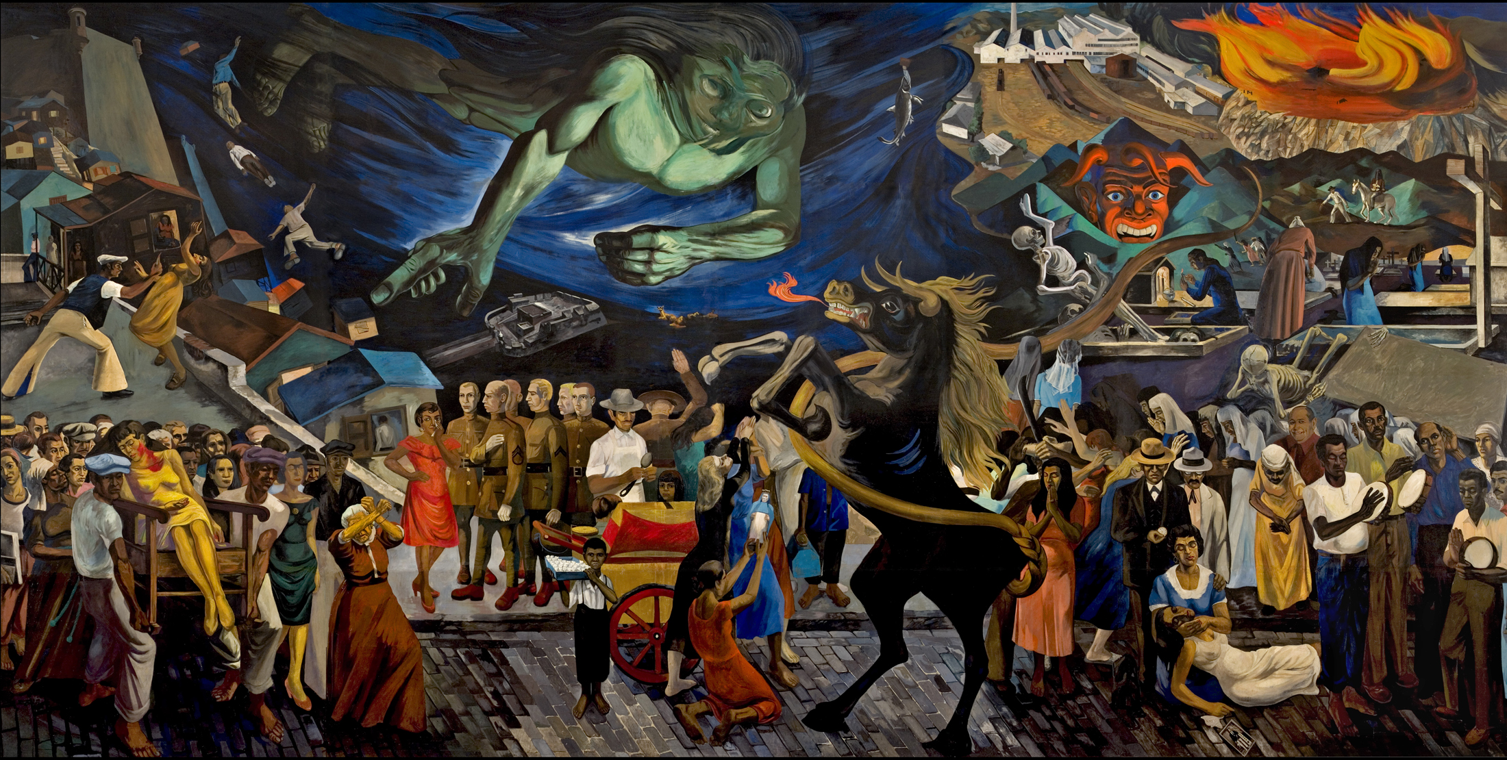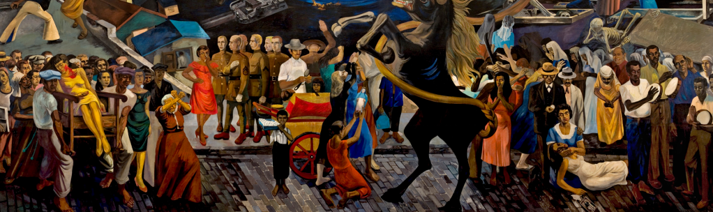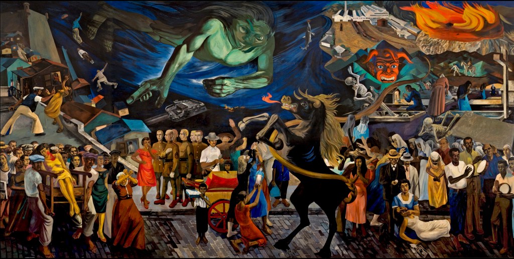 So we know what is in the painting and what it is meant to represent on a superficial level. I think Tufiño was showing influences of populist art, using the stories told in la plena to capture the scale of Puerto Rican history. For a tiny place, there is a lot of history there, and so often, the unrelenting thump of capitalism pushes back the old in place of the new. Once they have sold you an old product or something that exists in the public domain, it loses value in the West. By making this a mural of such a breathtaking scale, Tufiño wants the viewer to be reminded of the richness of his people’s stories and culture. I also think there are allusions to the way colonialism used religion as a means to subjugate people.