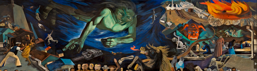 On the right side of the central figure are several images of separate places & events, possibly linked in a more significant way. There is a train yard & a fire nearby. A man leads a burro, and a figure sits on the animal shrouded in a black veil, likely to mean Death. The man is leading the animal through hills. Nestled in the center of the largest cluster of hills is a stylized red face, leering with three horns. I assume this is meant to be a representation of the Christian Devil. This also causes me to wonder if the man, the burro, and the veiled figure are some sort of reinterpretation of Mary & Joseph on their way to Bethlehem. Catholicism has a strong foothold in Puerto Rico, as in many Spanish-speaking countries, due to its violent imposition on the indigenous people by colonizers. There are figures at the base of the hills pointing at the Devil’s face. Below them are several images of death. Women grieve over graves in a cemetery. However, skeletons push the stones aside and climb out of their graves. Is this the work of the Devil or something else?