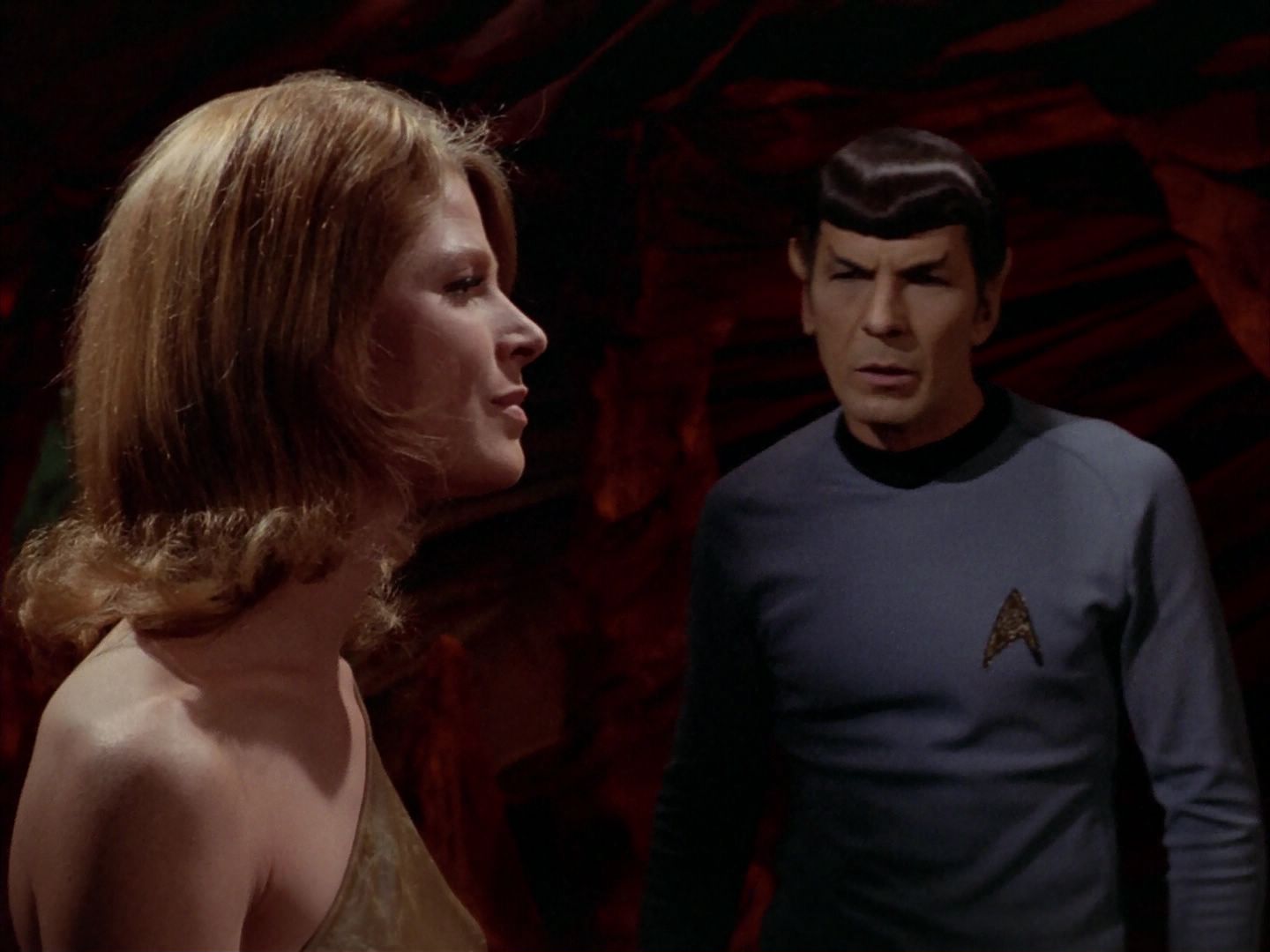 Kirk finds he is in a period resembling Earth’s 17th-century England. McCoy and Spock, however, end up in the equivalent of Earth’s ice age. Kirk gets accused of being a witch and has to argue his way out of that situation. Meanwhile, McCoy and Spock meet Zarabeth (Mariette Hartley). Spock begins displaying an uncharacteristic level of emotions, and McCoy realizes that moving through time has devolved the Vulcan to a pre-stoic era of his species. Nevertheless, Spock can maintain his composure despite having intense feelings for Zarabeth. Eventually, everyone makes it back and leaves the planet before the nova.