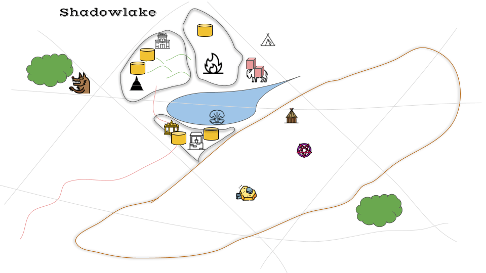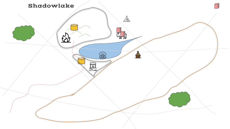 We roll on the Purpose and Decision tables to determine why and where our settlers came to this land. Our purpose for settling here was a “useful natural resource.” Lakes are often water holes for herd animals, and a proliferation of food is a good reason to settle in a place. I introduced herd beasts to the map as a resource and put them near the lake. Our Decision to settle where we did came up as “Nomads in Need.” We were the survivors of a horrible plague in the Old World and moved as a group until we came to this pleasant spot in the shadow of the plateau.