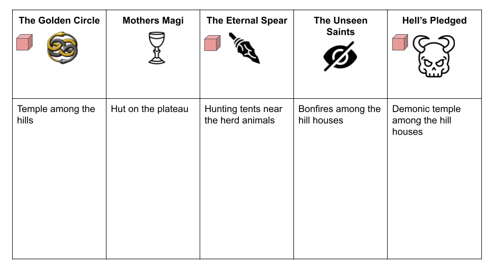 Founding continues by determining the Starting Hierarchy that governs the settlement. I rolled up a “Ruling Caste” and decided a wealthy group led the nomads, using them as cheap labor along the way and with plans to continue that when a home was found. They use religion and the twisting of scripture to keep their flock in check. Naturally, we create the Factions in conflict once this is determined. I rolled “Complex Web,” giving me three factions locked in a tense balance of power.