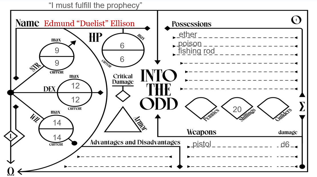 For my solo playthrough, I made use of a few extra tools. First, I used Alone in the Odd, a supplement designed specifically for solo play. It provides a Yes/No oracle and a Spark table to roll on, which offers words to inspire events and worldbuilding. I also used this fan-made character sheet because I loved the simple minimalist design. Very easy to read and see where everything is at. Finally, I used this online character generator, The Odd Generator, to give me who I was playing and their stats to add more randomness to my solo play.