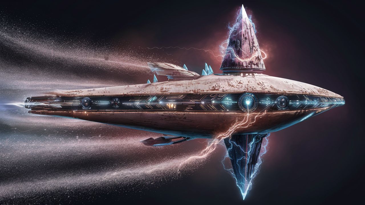 Standing sentinel atop the ship was a crystalline spire, shimmering with luminescence that seemed to pulse with the rhythms of the cosmos. This crystalline beacon served as a focal point for the vessel’s mystical energies, channeling the arcane forces that powered its propulsion systems.