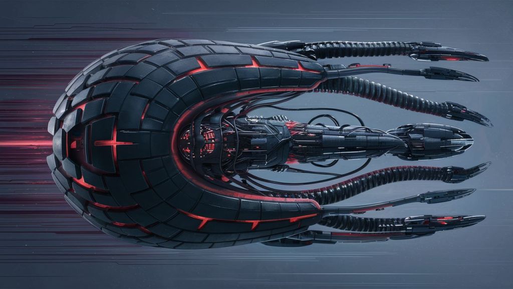 Cut to the system’s edges, four sleek writing cybernetic objects are zooming through space. They communicate in an intelligible techno-language to each other. They are making their way to Borges Station.