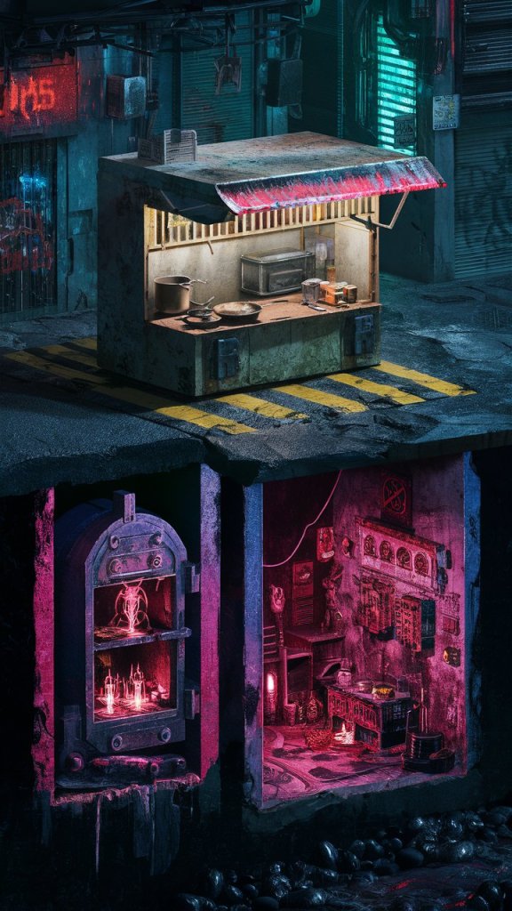 There’s a counter open to the street with places to stand. Clearly, sitting is not encouraged. The cook is on roller skates, which is only made to look even stranger as the woman is clearly a bodybuilder using whatever steroids she can get her hands on. The fluorescent veins are a dead giveaway of that, using black market shit that can’t get rid of the toxins. Yet another counterpoint, despite her imposing size, Zalec detects she’s a frail woman. Cook’s got burn scars up her hands & arms. Zalec relates, briefly touching the ones that mark her face. A glance down at a nametag that reads “Soma.”