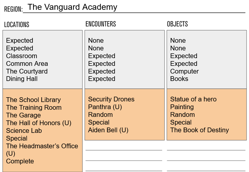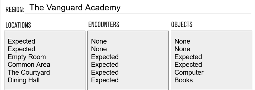 My Region will be The Vanguard Academy. I also want those first six slots for Locations, Encounters, and Objects to be reasonably generic but setting-specific to allow room for scenes in this Region to unfold close to the comic book tropes at play. This means I am using a lot of Expected and None tags to ensure that. You can see the top six below.