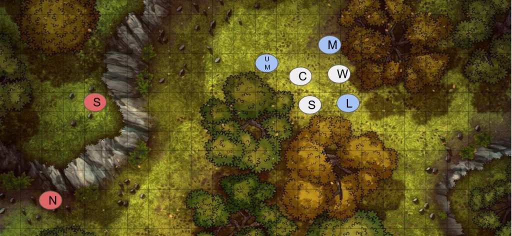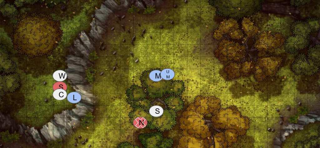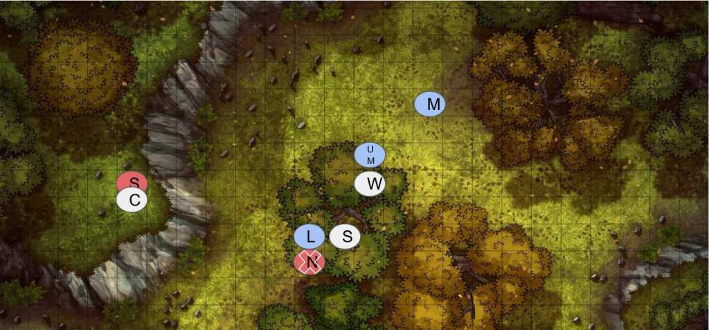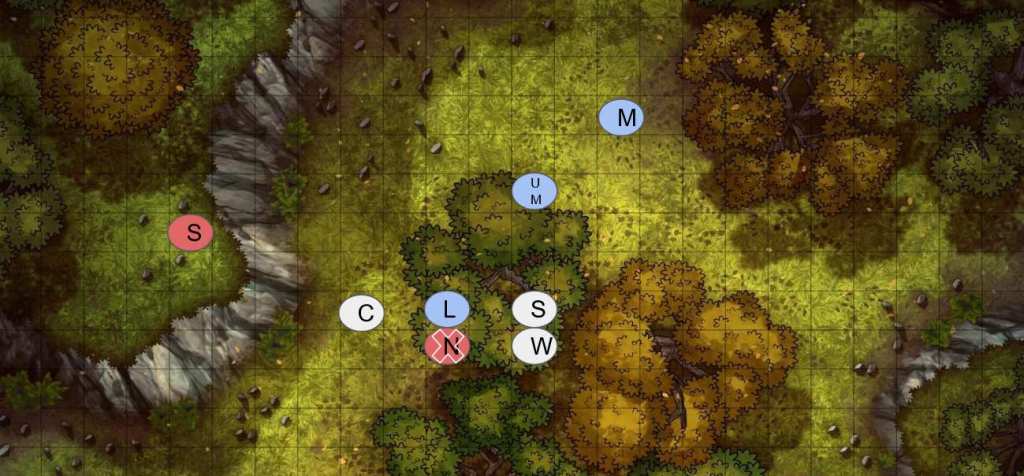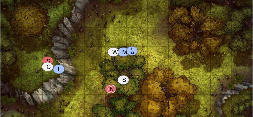(I don’t typically do granular combat when I play solo TTRPGs, but I thought I’d try it here. I provide maps every few rounds to show where the characters are in relation to each other.)
