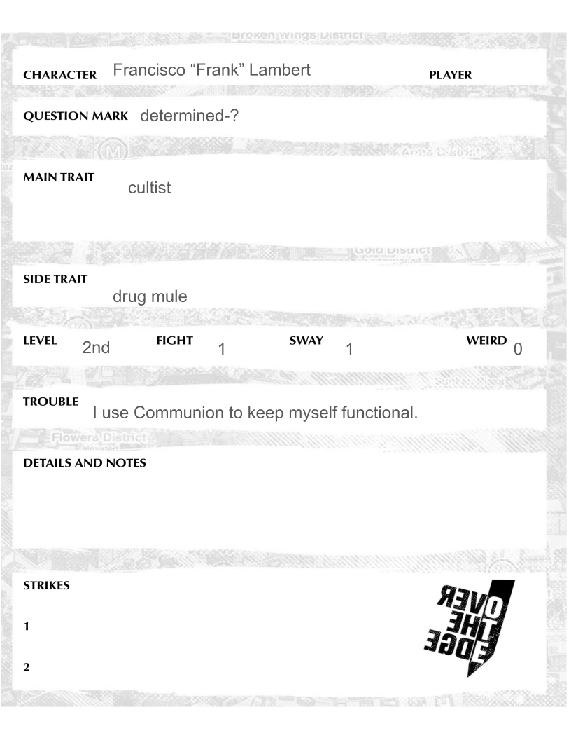 Francisco “Frank” Lambert is from Quebec originally. He had a rough childhood & adolescence which got him involved in drugs and crime. This is what led to his involvement with The Celestial Spire Syndicate (CSS). They think reality is a spiral staircase leading to enlightenment, and every action either ascends or descends one step. The ultimate goal is to “reach the apex” and become one with the cosmos. Their leader, Orbitus LaCroix, is a former architect who claims they glimpsed the spiral during a near-death experience in the late 1980s. LaCroix demands that his followers obsessively document their daily actions, judging each as a step up or down.