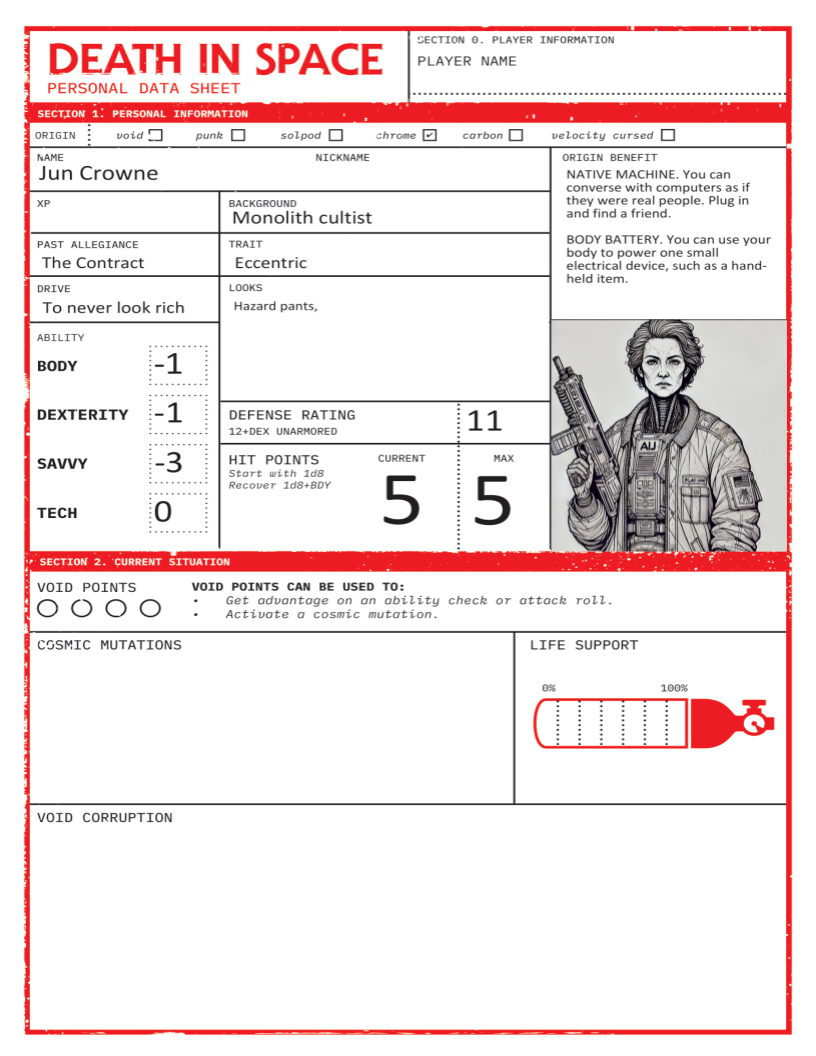 I sat down with my dice and rolled up Jun Crowne, a Chrome (AI in a human shell).