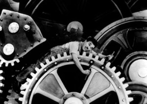 This is the last major American film to make uses of silent movie title cards (ignoring silent film parodies that would come after). Chaplin billed this as his first “talkie” but plays with audience expectations while making a point. The only voices heard come from the abstract machinery of the factory the Little Tramp works in. It was all part of Chaplin’s ideas about how technology was being used improperly and, instead of empowering mankind, it was being used to take their humanity away. Chaplin also wrote the film’s ending song “Smile”, which has become a standard since (“Smile though your heart is aching Smile even though its breaking”).